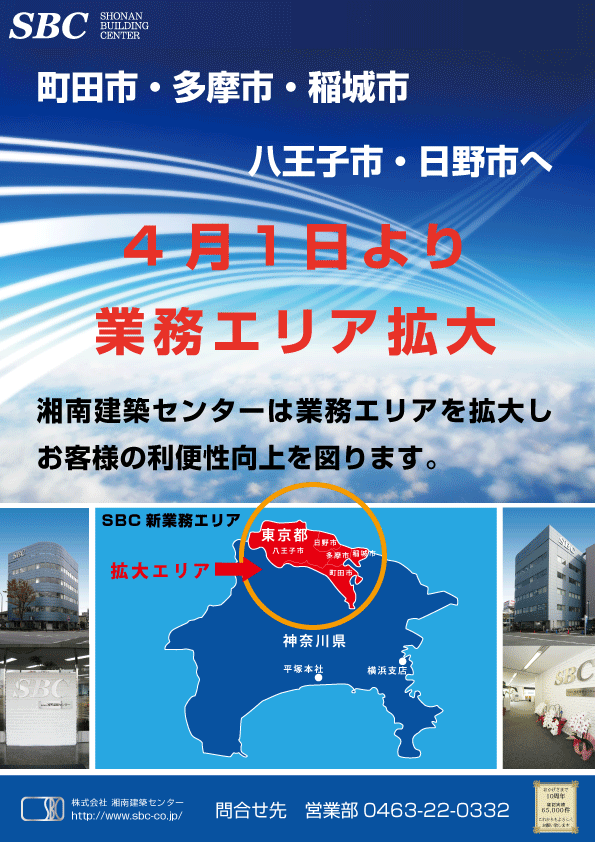 お陰様でSBCは創立10周年を迎える事が出来ました。同時に4月1日より国土交通省関東地方整備局の指定を受けて新たなスタートを切ります。これもひとえに弊社をご愛顧頂いている皆様のお陰と深く感謝申し上げます。業務エリアは従来の神奈川県全域に加え、東京都西部の5市(町田市、八王子市、日野市、多摩市、稲城市)に拡大致しました。今後も皆様の幅広いご要望にお応えできる指定機関・評価機関として精進して参りますので皆様のご愛顧並びにご支援・ご鞭撻の程、宜しくお願い申し上げます。