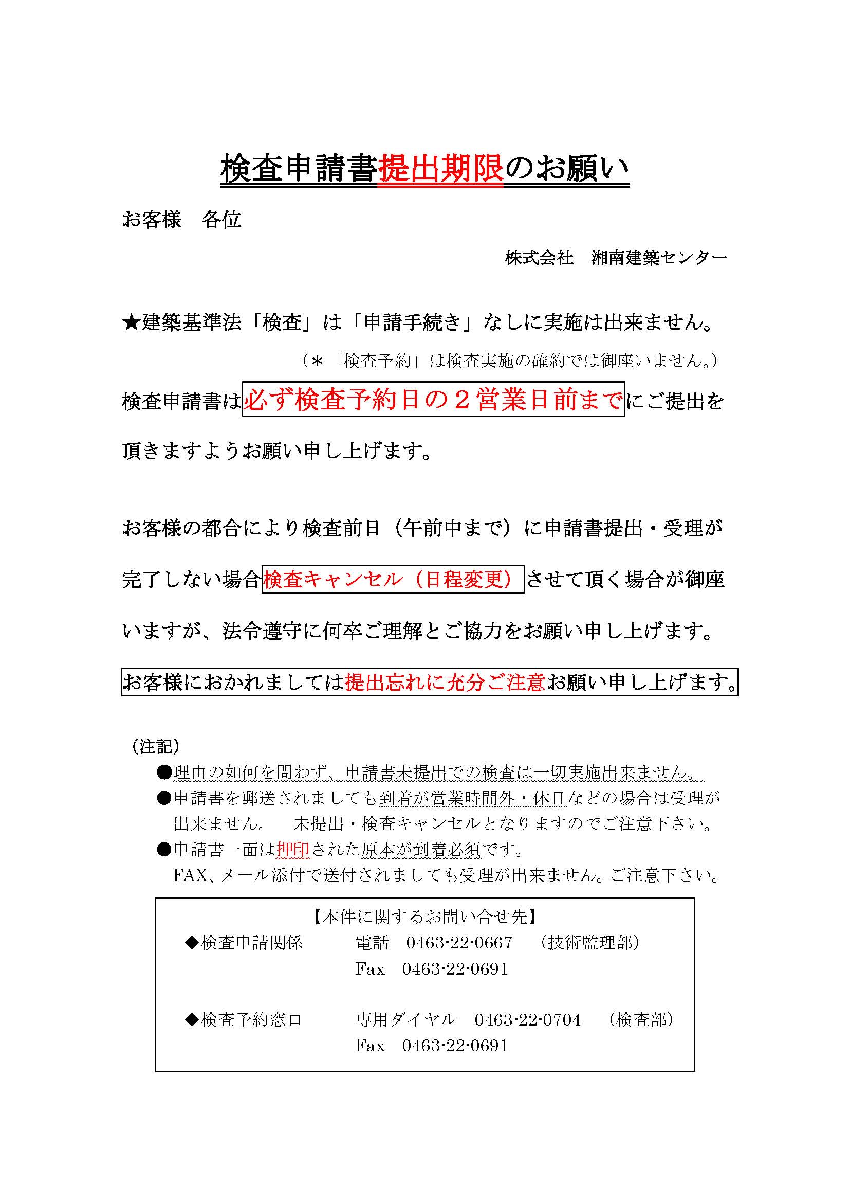 検査申請書提出期限につきまして皆様にお願いで御座います。